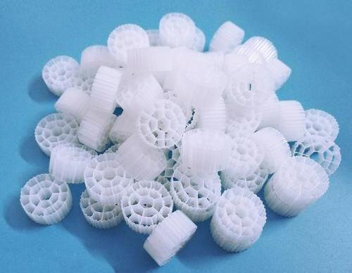 在無(wú)機(jī)物原材料共混的基本上,在PE中添加具備親水多功能性官能團(tuán)異構(gòu)化學(xué)物質(zhì),使流化床填料的吸水性提升,掛膜更快,提升微生物菌種的粘附工作能力。另外使流化床填料的相對(duì)密度更貼近于水,掛膜前0.96-0.98g/cm3,掛膜后的相對(duì)密度做到1.0g/cm3上下,使其在管式反應(yīng)器便于與流水混和流動(dòng)性。