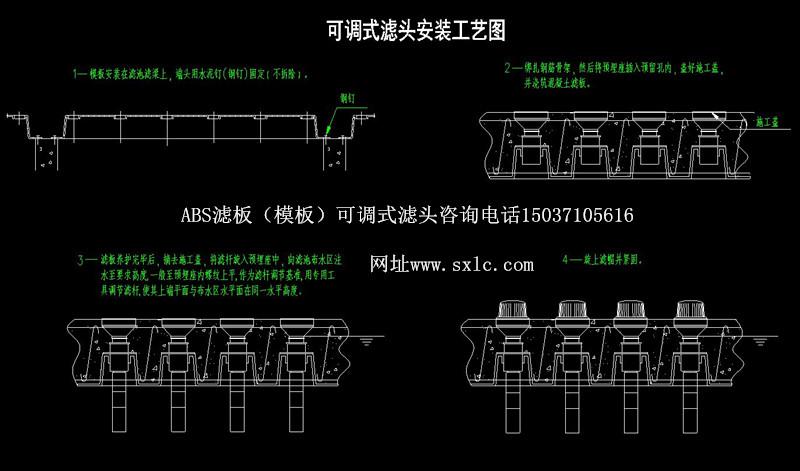 水廠濾池氣水反沖洗濾池常用的濾板有預(yù)制濾板和現(xiàn)澆整體濾板兩種:濾頭分為固定式和可調(diào)式兩種.固定式適應(yīng)于預(yù)制濾板:可調(diào)式長柄濾頭特別適應(yīng)于現(xiàn)澆濾板.也適應(yīng)于預(yù)制濾板.QSK-ll型可調(diào)式長柄濾頭原料采用高強(qiáng)度ABS顆粒樹脂(簡稱ABS工程塑料)經(jīng)高溫?zé)崛苡删苣ゾ叱尚?烧{(diào)式濾頭主要用:濾帽、濾桿、預(yù)埋座組成,濾桿上設(shè)有調(diào)節(jié)螺紋,可供上下調(diào)節(jié);且設(shè)有調(diào)節(jié)瓣與預(yù)埋座內(nèi)調(diào)節(jié)瓣防脫條結(jié)合,可控制濾桿調(diào)節(jié)精度,同時固定其位置。