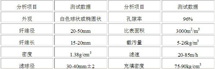 96%,充填密度50kg/cm3,比表面積3000m2/m3。改性纖維球絲徑細,比表面積大,比表面積高達2000m/g。由于纖維絲徑細的特點,它疊加后濾層孔隙小,而疊加后濾層孔隙度在80%以上,對懸浮物的攔截作用比其他濾料都優良,因此對低滲透油藏的注入水處理尤為理想;對高懸浮物水的排放和回用有要求的過濾更加適用。